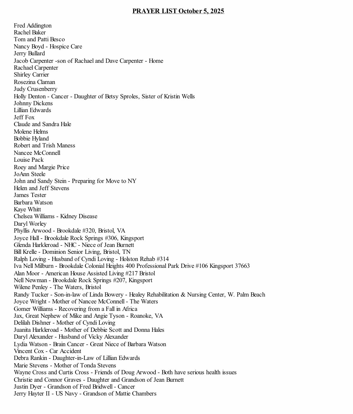 Prayer List: October 5, 2025 *the prayer list is updated every Friday