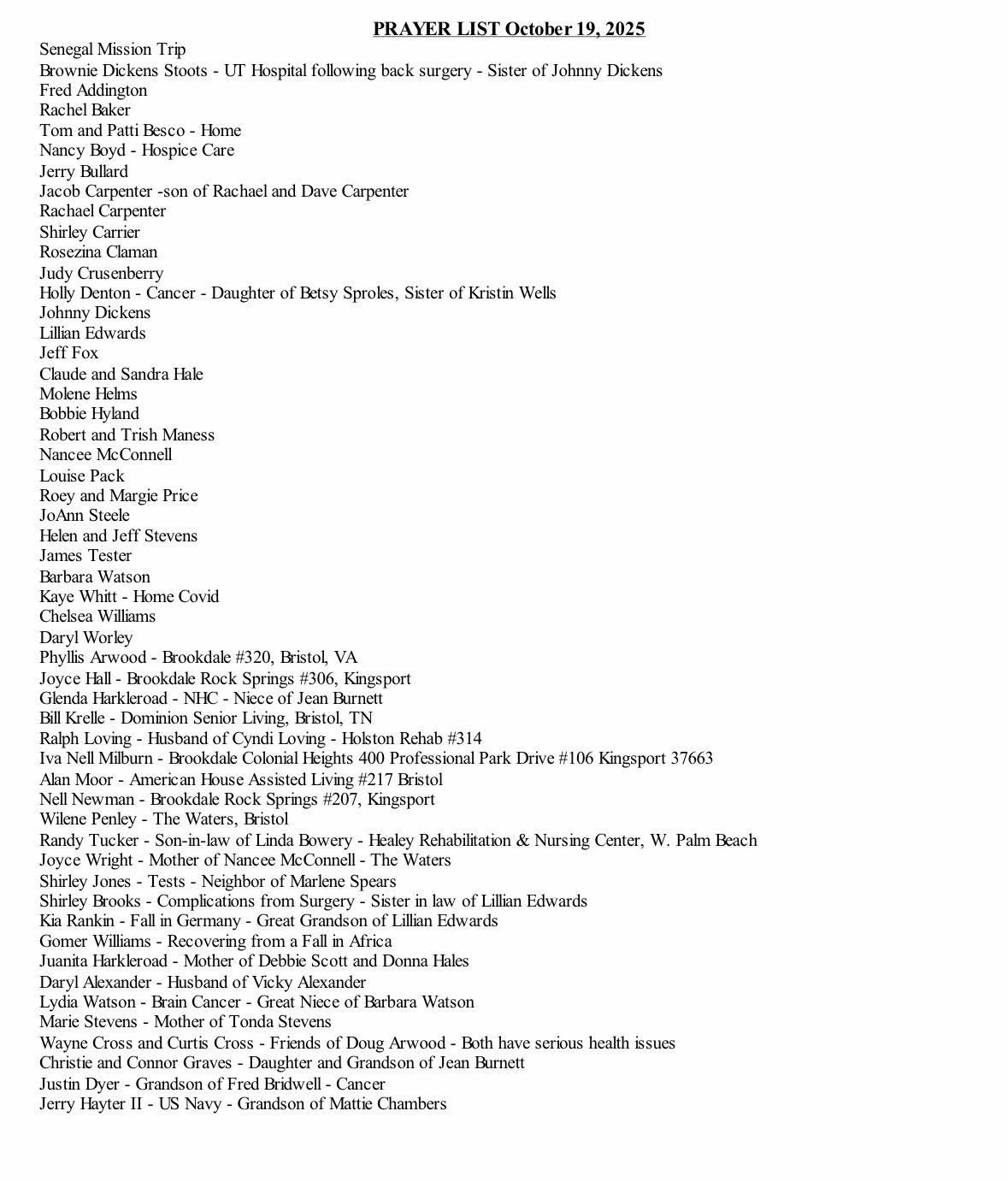 Prayer List: October 19, 2025 *the prayer list is updated every Friday