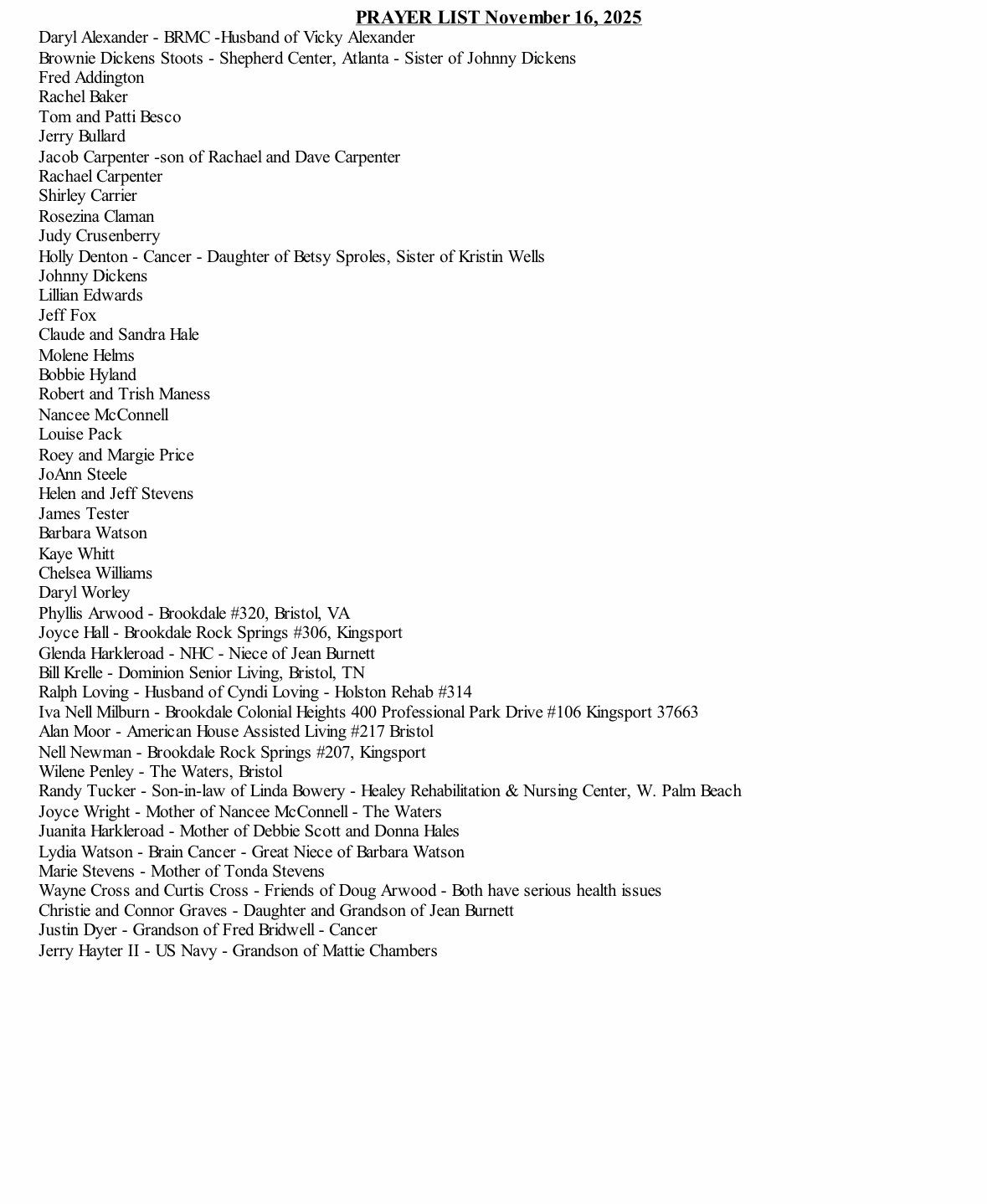 Prayer List: November 16, 2025 *the prayer list is updated every Friday
