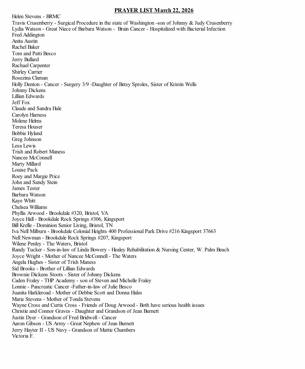 Prayer List: March 22, 2026 *the prayer list is updated every Friday