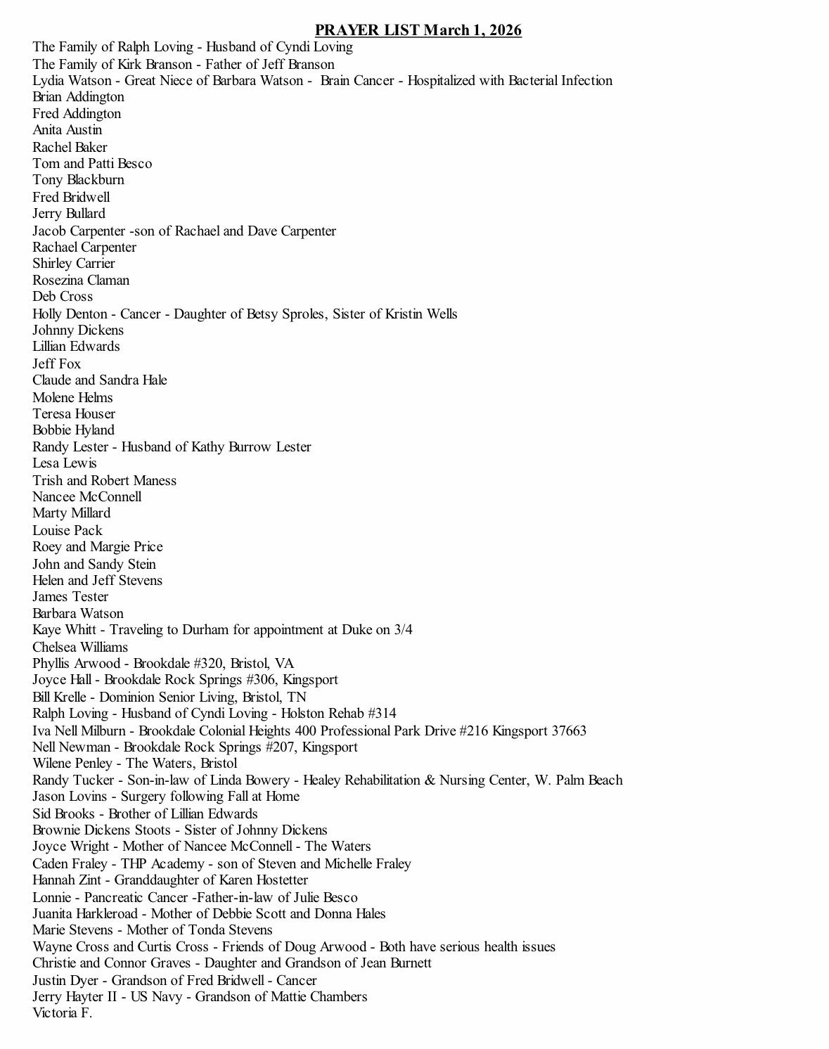 Prayer List: March 1, 2026 *the prayer list is updated every Friday