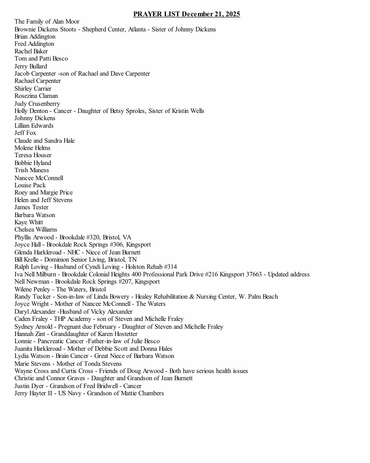 Prayer List: December 21, 2025 *the prayer list is updated every Friday
