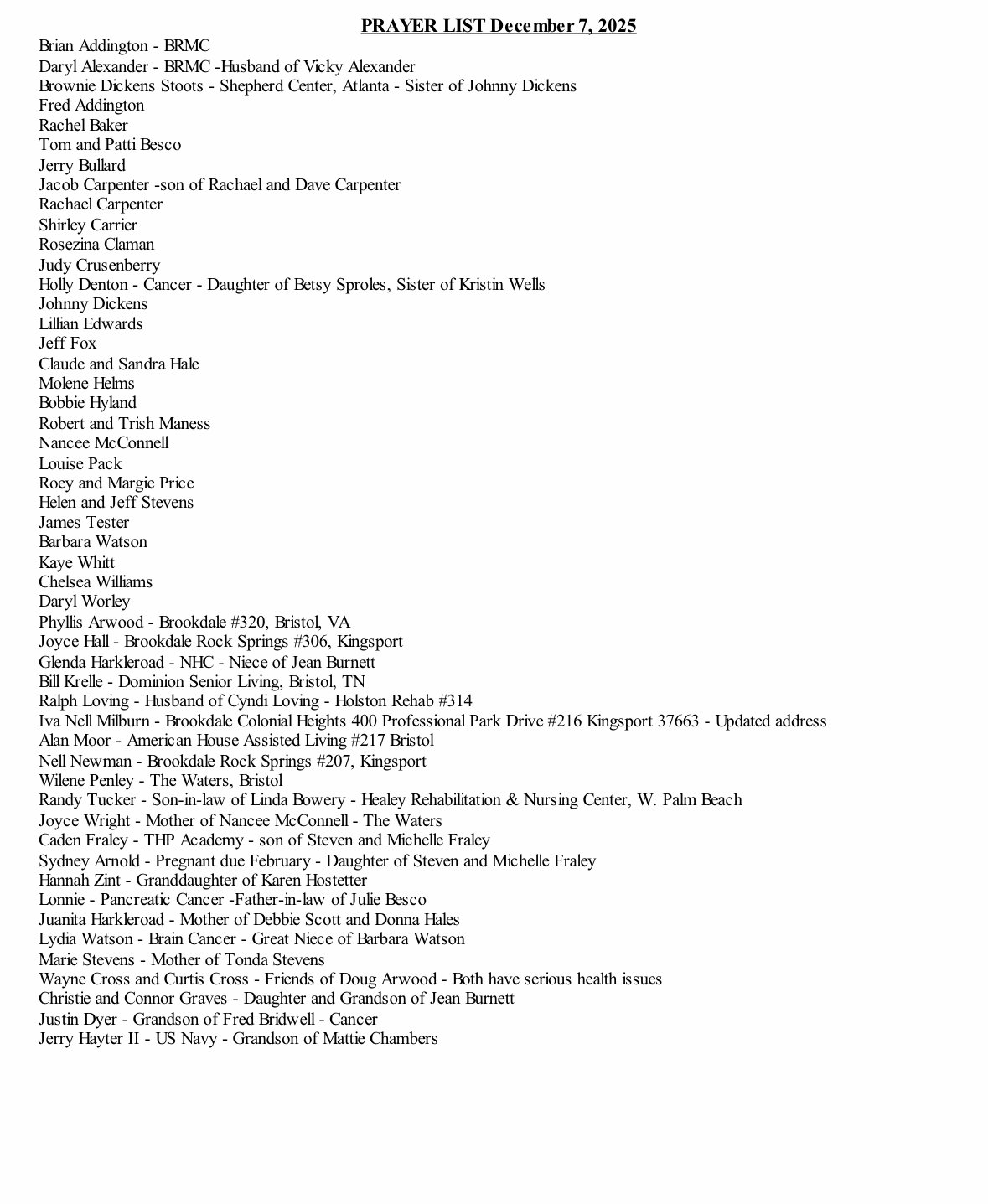 Prayer List: December 7, 2025 *the prayer list is updated every Friday